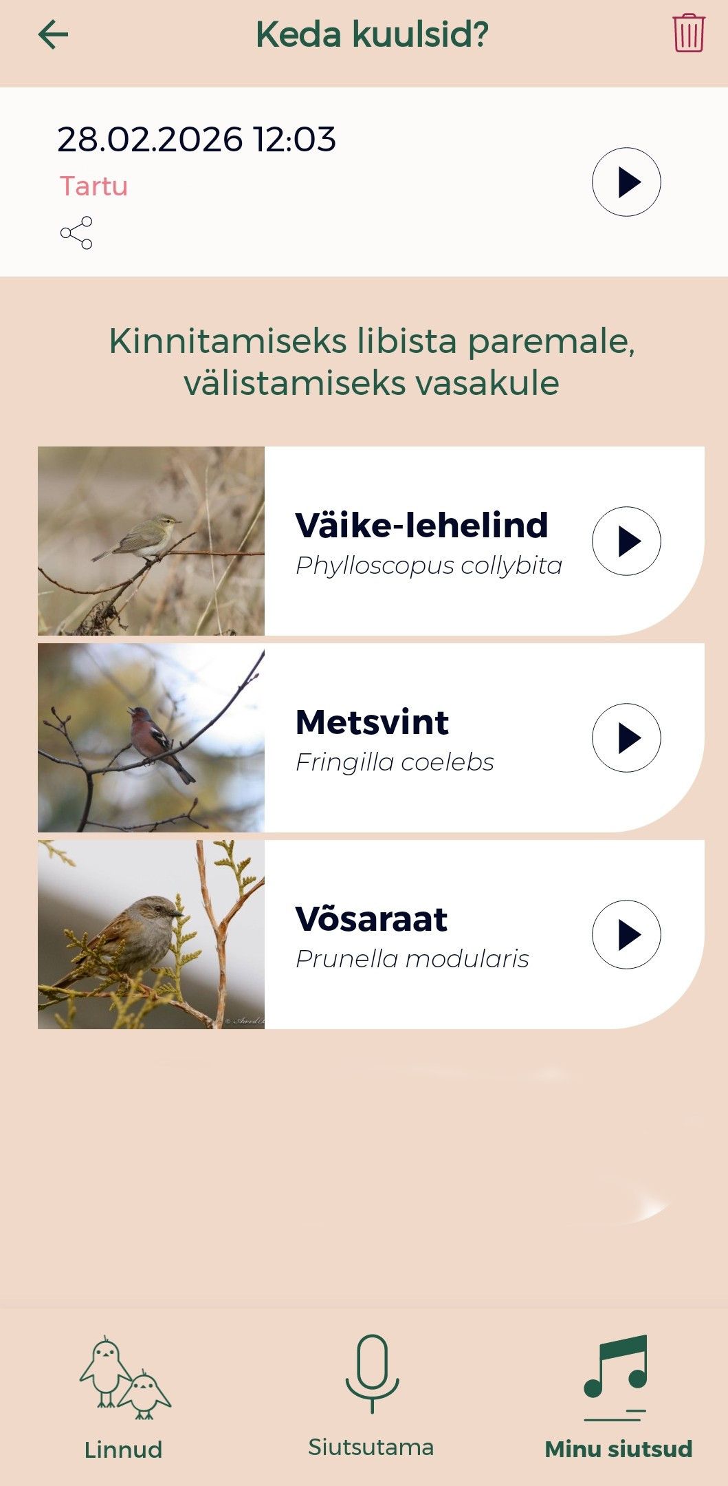 Siiski ei ole AI kõikvõimas ja pakutu suhtes tuleb alati kriitiline olla. See võib näida tüütu (milleks meile siis üldse AI?), kuid nõuab kokkuvõttes märksa vähem aega kui igasuguste eelteadmisteta internetis tuhnimine. Enne kui vaatlustulemuse andmebaasi laadid, mõtle läbi: kas pakutud liigi salvestus tundub minu kuulduga sarnane? Kas see liik saab üldse märtsikuus Eestis viibida? Nii jääb endale õppimisrõõm ka alles ja peagi taipad, et vajad nutikat abivahendit aina vähem.